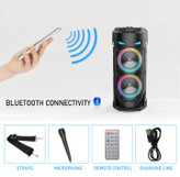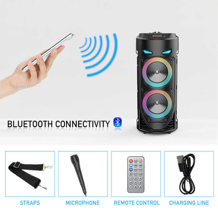 اسپیکر ،کابل شارژ،ریموت کنترل، بند رو دوشی ،میکروفون سیم دار